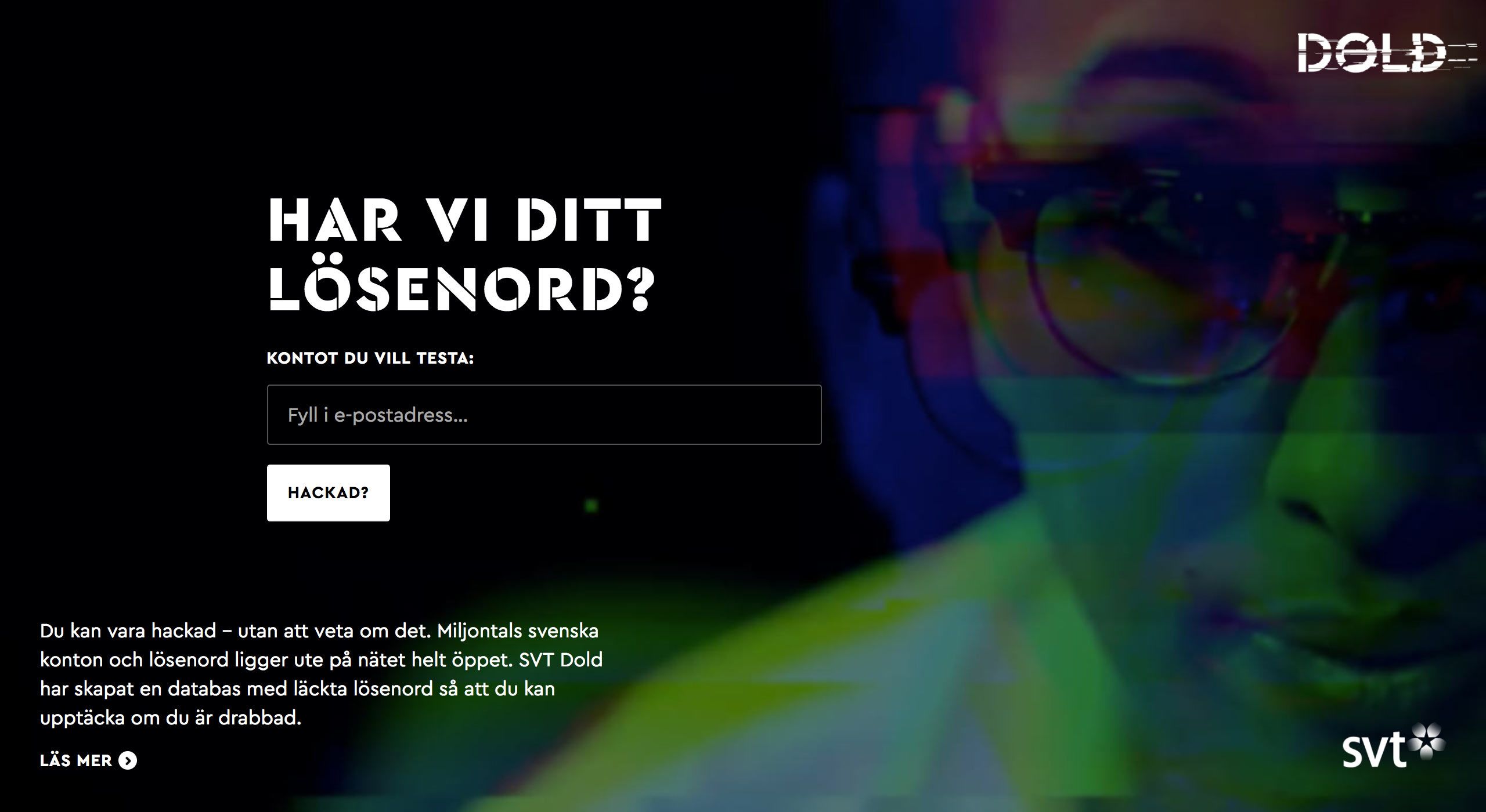 Har vi ditt lösenord? was a service to complement SVT Dold’s reportage on password security. Users could inquire whether their login details were part of the over 1 billion accounts that SVT compiled from data breaches. If the login details were found, the user could request an email with information about the hacked websites, and instructions on how to improve the user’s password security.